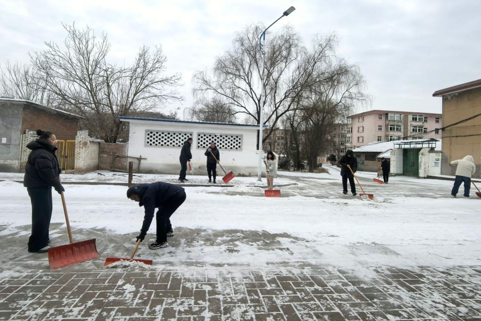 除雪小組的工作人員手持鐵鍬、推雪板、掃帚等工具,冒著凜冽寒風開始作業(yè),有的揮舞鐵鍬破冰鏟雪,有的推著推雪板清理積雪,有的用掃帚細致清掃殘余冰雪,分工協作、有條不紊。冰冷的雪花落在臉上、鉆進衣領,浸濕了衣物,但大家絲毫沒有退縮,干勁十足,現場一派熱火朝天的勞動景象。經過全體工作人員三小時的連續(xù)奮戰(zhàn),小區(qū)內各主干道、出入口及重點區(qū)域的積雪已全部清理完畢,道路恢復暢通,確保了居民正常出行不受影響。