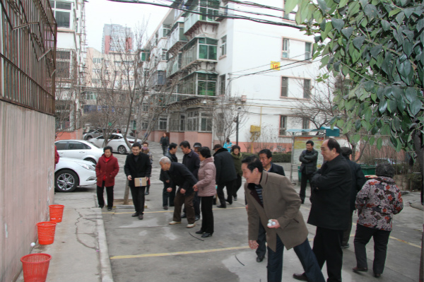 該社區(qū)精心組織了猜謎語、盲人擊鼓、釣魚、滾球、托球跑等多種娛樂項目,各個項目分片劃定區(qū)域。在猜謎語區(qū),數(shù)條繩子懸掛著五顏六色的謎語,迎風招展;在盲人擊鼓區(qū),參加者蒙著雙眼原地轉圈后拿著鼓槌亂敲,逗的觀眾不時哄笑;小區(qū)買菜的住戶也放下菜,抱著籃球往門洞里滾,一次不行再來一次,一副不滾進球不罷休的勢頭;小朋友最愛玩的就是放鞭炮了,他們拿著長棍上綁的煙頭去點“魚炮”。對成功的參與者發(fā)個小禮品,整個場面非常熱鬧,始終充滿著歡聲笑語。