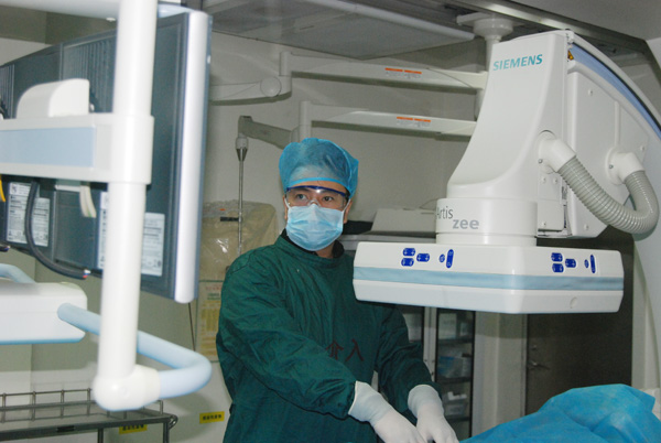 數(shù)日前,患者在行走時(shí)不慎摔倒致傷腰部,感到劇烈腰疼,不能起床,嚴(yán)重影響生活質(zhì)量。經(jīng)CT檢查為腰1椎體壓縮性骨折,老年患者同時(shí)還伴有高血壓、糖尿病等多種疾病。入院后,骨外科副主任王宏剛認(rèn)真檢查,仔細(xì)研討病歷,認(rèn)為老年患者體質(zhì)差,不能耐受常規(guī)手術(shù),決定為患者實(shí)施微創(chuàng)手術(shù)——椎體擴(kuò)張球囊形成術(shù)。此手術(shù)是在X光或CT檢查確定位置后,在放射成像系統(tǒng)的引導(dǎo)下,確定穿刺位置,局部麻醉后,插入穿刺針,按入球囊進(jìn)行擴(kuò)張,注入造影劑,顯示椎體恢復(fù)高度后,抽出造影劑,注入骨水泥。待骨水泥凝固后,從而使塌陷的椎體適當(dāng)恢復(fù)高度,復(fù)位和穩(wěn)定骨折,減少脊柱的畸形,緩解疼痛。整個(gè)手術(shù)過程僅僅半小時(shí)左右。