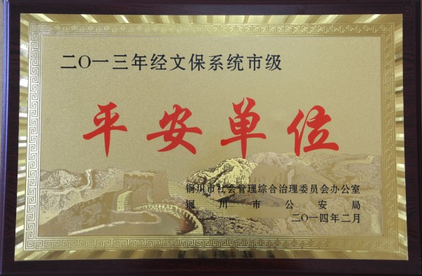 近日,銅川市社會管理綜合治理委員會辦公室、銅川市公安局聯(lián)合授予陳家山煤礦2013年度全市經(jīng)文保系統(tǒng)“平安單位”榮譽(yù)稱號。