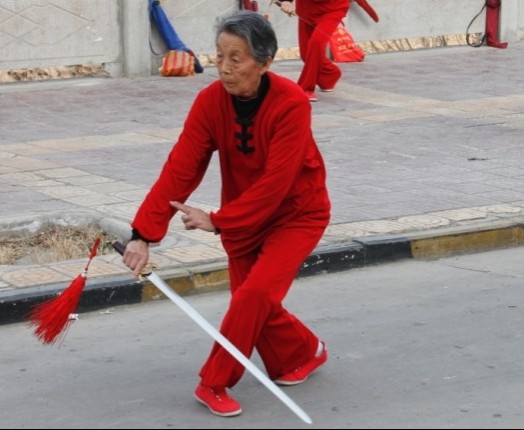 75歲崔秀珍老人在練習太極劍