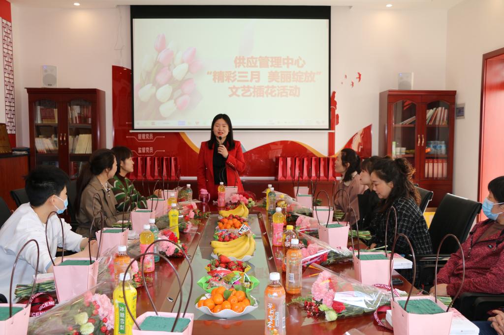 為慶祝第113個“三八國際勞動婦女節(jié)”,讓女職工用自己的巧手和智慧,感受插花藝術(shù)的魅力.3月7日上午,供應(yīng)中心組織全體女職工開展了“精彩三月 美麗綻放 ”為主題的藝術(shù)插花活動。