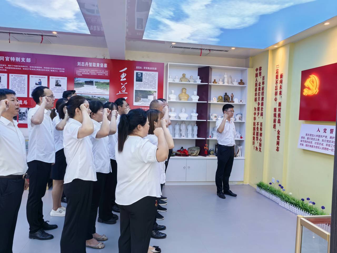 活動(dòng)當(dāng)天,全體黨員在柿樹(shù)溝社區(qū)的院中聆聽(tīng)了該社區(qū)的概況及2023年三件大事、十件實(shí)事詳述,隨后在工作人員帶領(lǐng)下,先后參觀了傳統(tǒng)文化館、家風(fēng)館、小樹(shù)苗成長(zhǎng)館、婦女兒童關(guān)懷廳、黨史教育館、徐崇林書(shū)屋、秦風(fēng)崗文學(xué)館、多功能服務(wù)大廳、圖書(shū)室等9個(gè)展館。在黨史館中大家聆聽(tīng)著不同年代的紅色故事,展放的紅色物品也使黨員們產(chǎn)生了濃厚的興趣,一枚枚戰(zhàn)斗紀(jì)念章、一本本小人書(shū)、一件件老物件都在無(wú)聲的講述著他們的故事,深深吸引著大家的目光,仿佛時(shí)光又回到了那波瀾壯闊的年代,使大家重溫了光輝的革命歷史,接受了黨性教育。并與柿樹(shù)溝社區(qū)的黨員同志共同進(jìn)行了宣誓承諾。