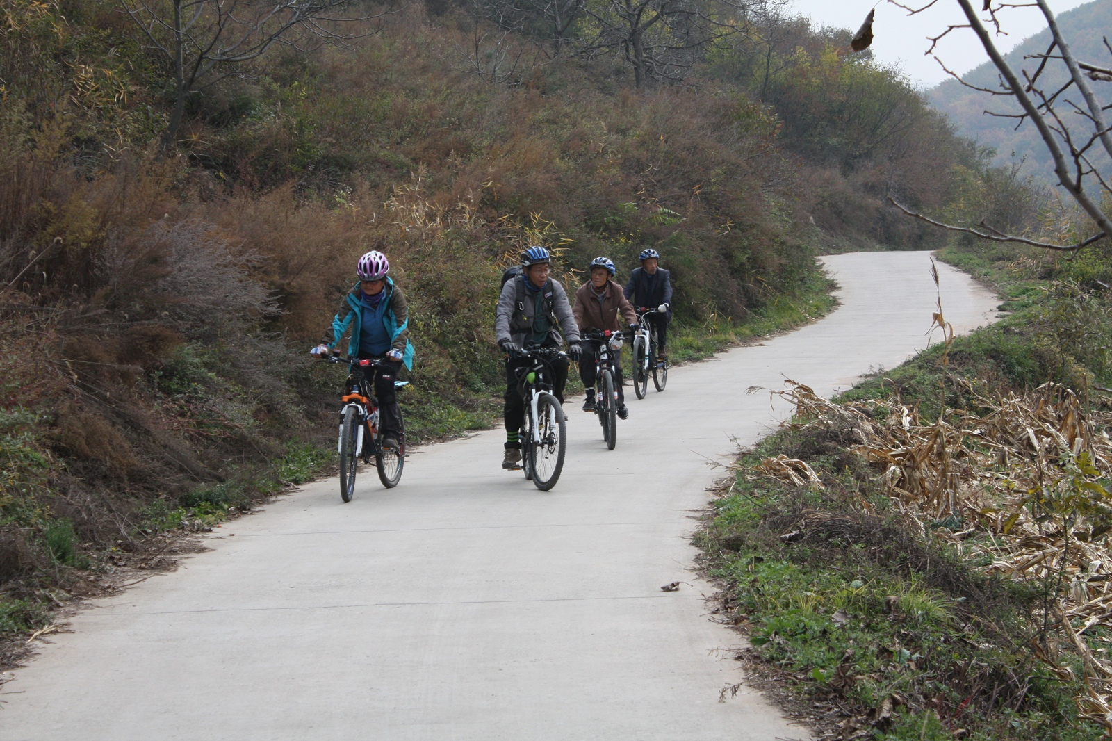 周六早晨八點(diǎn)許,八個(gè)驢友相約騎行云夢(mèng)山。仲秋時(shí)節(jié),大概是受霧霾影響,天干霧騰,空氣通透不是太好,但總比窩在蝸居里好多了。秋高氣爽,適宜騎行,大家你追我趕,不甘示后,結(jié)果,有兩個(gè)驢友像射飛靶的子彈,順著山梁直插而去,我等隨后追趕不見蹤影,無奈拐道下山,當(dāng)了一回穿山甲、鉆山豹。一路泉水潺潺喜鵲喳喳,跨過小橋飛瀑流水人家,滿耳流行音樂(自帶音響)一路歡歌,舉目“漫山紅遍層林盡染”,美不勝收。