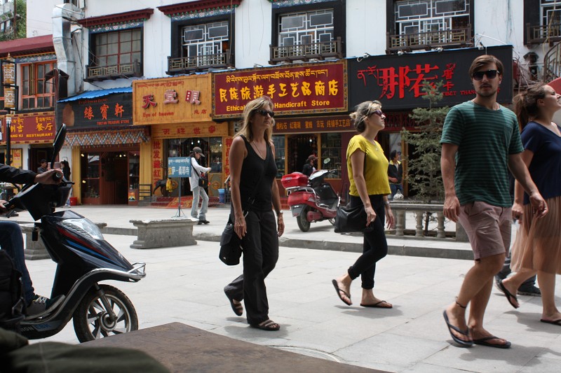 “抓拍”是件很有趣的事情。除了在旅途車上的“抓拍”外,在拉薩大街上和某個(gè)博物館的“抓拍”(事實(shí)上應(yīng)該算是“偷拍”)經(jīng)歷,也值得記憶下來。那天,參觀完大昭寺在大街邊的座椅上休息,見街道上的行人衣著、裝飾很有特色,尤其是姑娘們打扮的都很時(shí)尚,便有一種拍攝的沖動(dòng)??墒牵?dāng)你舉起相機(jī)準(zhǔn)備按下快門時(shí),有的人卻做出了拒絕的表示。后來,對(duì)相機(jī)進(jìn)行簡(jiǎn)單的設(shè)置,雙臂加起相機(jī),轉(zhuǎn)過頭去看其他地方,用余光感覺被拍攝者是不是進(jìn)了鏡頭,然后再按下快門,這一招還算管用,一口氣拍了二三十張,效果也算可以。在博物館里是禁止拍攝的??墒牵翘靺⒂^時(shí),面對(duì)展柜里擺放的有幾公斤重的黃金大印,禁不住誘惑,在十分低光照的情況下“抓拍”了幾張,回來查看效果還行。