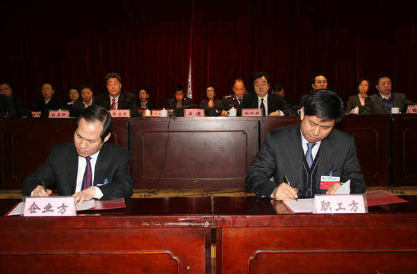 下午16時30分,公司常務(wù)副總經(jīng)理、安監(jiān)局長劉水利主持召開第二次全體代表大會。會上,企業(yè)方代表與職工方代表簽訂了公司《三個集體合同》,通報了民主測評結(jié)果,表決通過了大會決議。