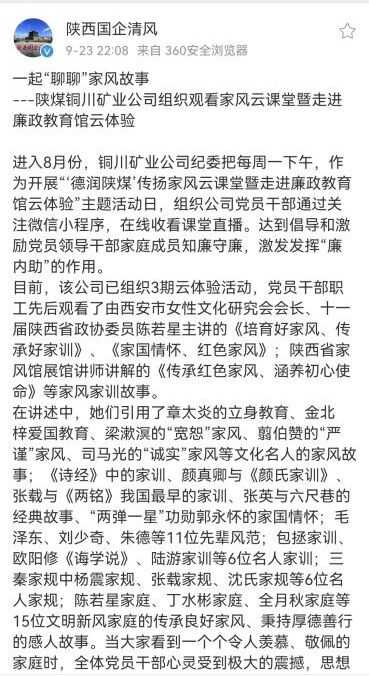 進(jìn)入8月份,銅川礦業(yè)公司紀(jì)委把每周一下午,作為開展“‘德潤(rùn)陜煤’傳揚(yáng)家風(fēng)云課堂暨走進(jìn)廉政教育館云體驗(yàn)”主題活動(dòng)日,組織公司黨員干部通過關(guān)注微信小程序,在線收看課堂直播。達(dá)到倡導(dǎo)和激勵(lì)黨員領(lǐng)導(dǎo)干部家庭成員知廉守廉,激發(fā)發(fā)揮“廉內(nèi)助”的作用。