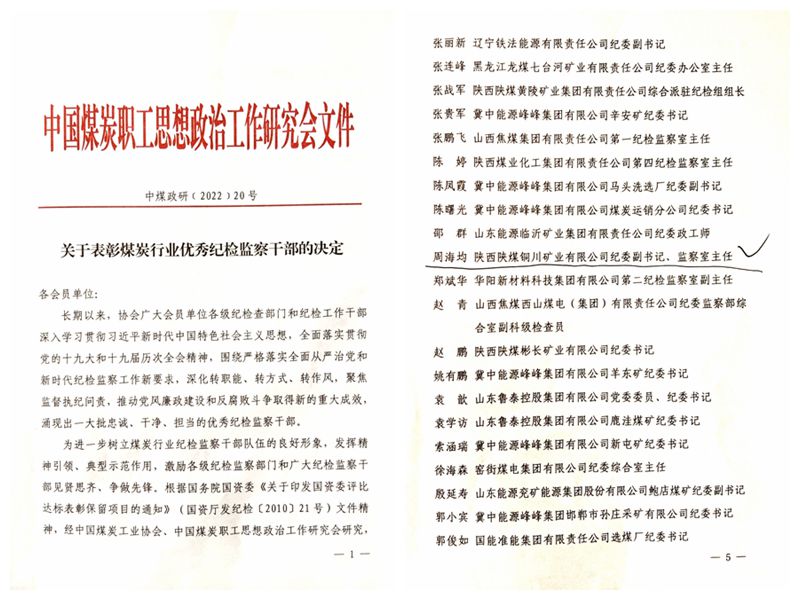公司職工周海均被中煤政研會評為煤炭行業(yè)優(yōu)秀紀檢監(jiān)察干部