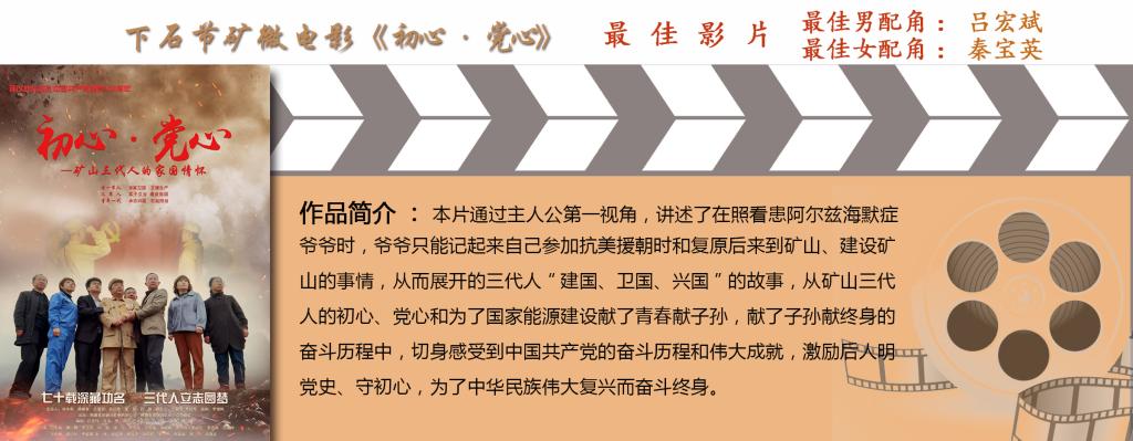 其中微電影《初心·黨心》以銅川礦區(qū)礦工三代奉獻(xiàn)礦山的事跡為創(chuàng)作背景,圍繞傳承紅色基因,賡續(xù)精神血脈,通過對礦山三代人家國情懷的生動(dòng)展示,深刻詮釋了銅煤人以初心鑒黨心,薪火相傳、奮斗創(chuàng)業(yè)的堅(jiān)定信仰和獻(xiàn)了青春獻(xiàn)子孫,獻(xiàn)了子孫獻(xiàn)終身的感人事跡。該作品憑借題材創(chuàng)意新穎、故事內(nèi)容感人、質(zhì)量效果上乘,一舉奪得“最佳影片”“最佳男配角”“最佳女配角”三項(xiàng)大獎(jiǎng)。