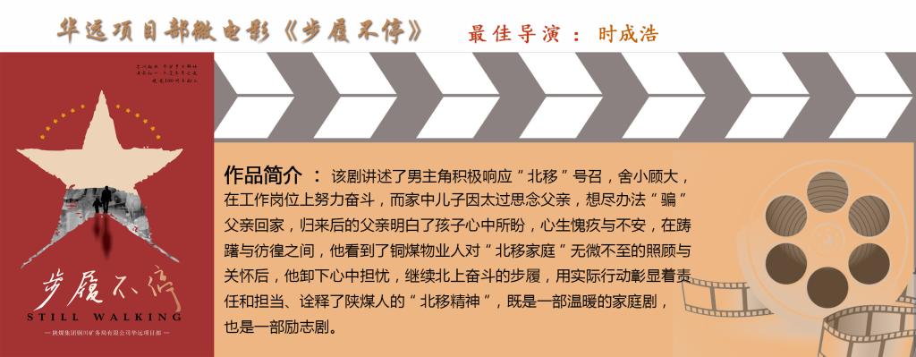 華遠(yuǎn)項(xiàng)目部微電影《步履不停》溫情勵(lì)志,通過趙明理與兒子之間的精神羈絆、兒子與父親的斗智斗勇,以及趙明理與老同學(xué)的敘舊、感懷,體現(xiàn)出銅煤外出創(chuàng)業(yè)人無私無畏、一往無前的責(zé)任擔(dān)當(dāng),榮獲“最佳導(dǎo)演”獎(jiǎng)。
