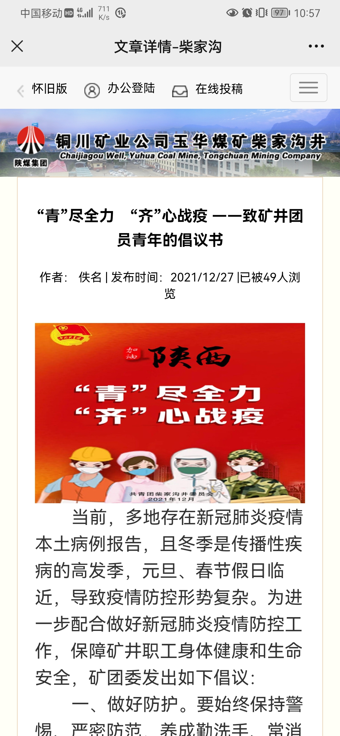 “紅馬甲”、“紅袖標(biāo)”在行動(dòng)。“您好,請(qǐng)出示行程碼和48小時(shí)核酸檢測(cè)結(jié)果,并進(jìn)行測(cè)溫登記”?!斑M(jìn)入餐廳佩戴好口罩,配合測(cè)溫、掃碼,打餐排隊(duì)保持一米以上距離并分散就坐避免密集?!鼻嗄曛驹刚邆兠刻齑┥霞t馬甲、戴上紅袖標(biāo)有序參與配合外來人員測(cè)溫掃碼登記,維持職工用餐秩序,定時(shí)定點(diǎn)進(jìn)行辦公場(chǎng)所消毒。在礦區(qū)大門、辦公樓口、區(qū)隊(duì)井口、職工食堂等關(guān)鍵場(chǎng)所到處能看到他們忙碌的身影。同時(shí),團(tuán)員青年還積極化身網(wǎng)絡(luò)宣傳員,運(yùn)用微信、抖音、微博等新進(jìn)行線上宣傳官方渠道發(fā)布的信息、宣傳防疫知識(shí)、解讀防控政策,傳播奮戰(zhàn)在防控一線的青年先進(jìn)典型和感人故事,弘揚(yáng)了正能量,在公司百里礦區(qū)營(yíng)造了良好輿論氛圍。