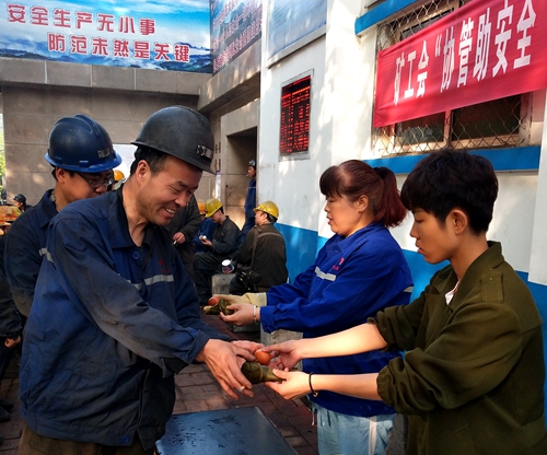 活動現(xiàn)場,該礦女工家屬協(xié)管安全員為上、下井的職工送上節(jié)日的祝福和親手包煮的愛心粽子、平安雞蛋等節(jié)日食品,并叮囑咐他們?yōu)榱俗约旱慕】岛图彝サ男腋#瑫r刻牢記安全,杜絕違章作業(yè),圓滿完成好各項任務(wù)。礦工們深受感動,堅決表示一定聽從指揮,自覺遵章守紀(jì),決不違章蠻干,為礦井安全生產(chǎn)貢獻自己的一份力量。