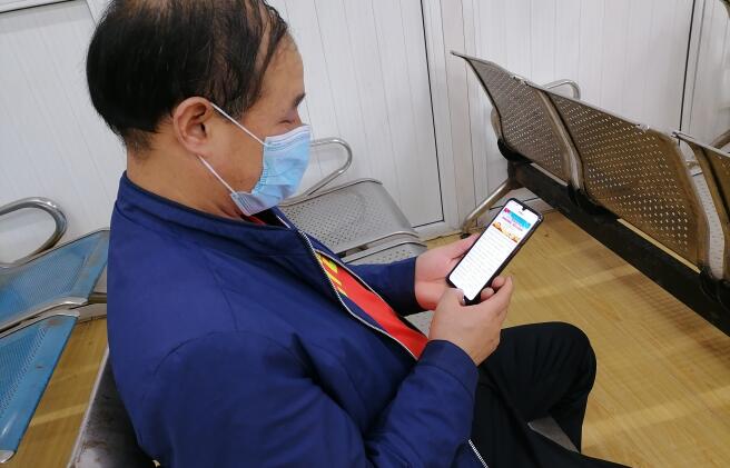 在項(xiàng)目部綜掘一隊(duì)下午班前會召開之前,職工趙文紅正在通過手機(jī)微信閱讀掘進(jìn)施工安全技術(shù)知識要點(diǎn)。