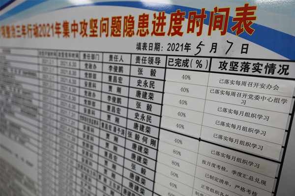 集中攻堅(jiān)“時(shí)間表”選擇擺放在調(diào)度指揮中心及候罐大廳,在職工上下班必經(jīng)之地進(jìn)行公示,將各專業(yè)安全責(zé)任落實(shí)拉出來“曬一曬”,使業(yè)務(wù)科室和基層單位的執(zhí)行能力“亮亮相”,讓全員自查安全意識(shí)行為“照鏡子”,主動(dòng)把集中攻堅(jiān)的過程和結(jié)果置于廣大職工監(jiān)督之下,傳導(dǎo)壓力匯聚合力解難題,每天看到新變化新進(jìn)展,堅(jiān)定打贏硬仗的信心和安全發(fā)展的決心,由守勢轉(zhuǎn)攻勢,全力推進(jìn)集中攻堅(jiān)。