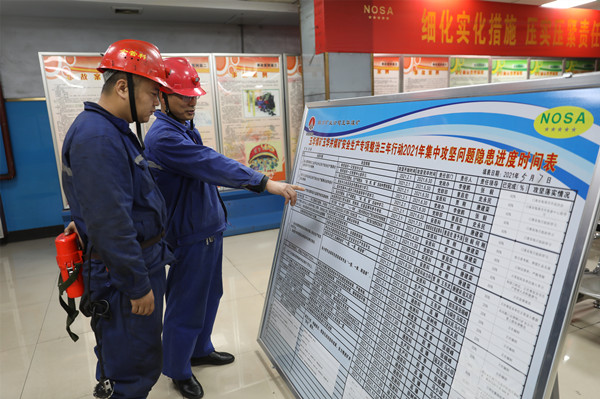 掛圖作戰(zhàn)加強集中攻堅。按照2021年集中攻堅問題隱患和制度措施“兩個清單”內(nèi)容,將各專業(yè)問題隱患形成清單和圖表。采用掛圖公示清單、掛圖分析分解的方式,每月組織召開一次安全專項整治三年行動集中攻堅推進會,研究解決集中攻堅工作中存在的問題,制定針對性措施。每周安全辦公會通報攻堅進度,協(xié)調(diào)隊伍部署階段任務(wù)。基層單位每天班前會通報任務(wù)進度倒排工期,落實責(zé)任到人。整體工作按照天推進,周小結(jié),月匯總的機制,掛圖作戰(zhàn)、精準(zhǔn)施策、強化措施、緊盯現(xiàn)場,緊密結(jié)合安全生產(chǎn)月事故隱患大掃除、百日安全生產(chǎn)大行動,充分利用安全管理提升的窗口期,明確時間節(jié)點緊盯19項集中攻堅任務(wù),狠抓“兩清單”落實,聚焦重大風(fēng)險防控,全力解決問題隱患,扎實推進重點整治工作任務(wù),推動礦井安全形勢持續(xù)穩(wěn)定向好。