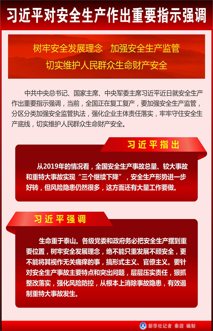 中共中央政治局常委、國務院總理李克強作出批示指出,當前,全國正處于統(tǒng)籌推進新冠肺炎疫情防控和復工復產(chǎn)的關鍵時期,安全生產(chǎn)意識和工作絲毫不能放松。各地區(qū)、各有關部門和各單位要堅持以習近平新時代中國特色社會主義思想為指導,認真貫徹落實黨中央、國務院決策部署,樹牢安全發(fā)展理念,層層壓實責任,深入排查各領域各環(huán)節(jié)安全生產(chǎn)隱患,全面開展安全生產(chǎn)專項整治三年行動,堅持系統(tǒng)治理、精準施策,扎實推進危險化學品、礦山、交通運輸、工業(yè)園、城市建設、危險廢物等重點領域安全整治,確保見到實效;加快建立健全安全生產(chǎn)責任和管理制度體系、隱患排查治理和風險防控體系,加強監(jiān)管執(zhí)法和安全服務,堅決遏制重特大事故發(fā)生,切實維護人民群眾生命財產(chǎn)安全。