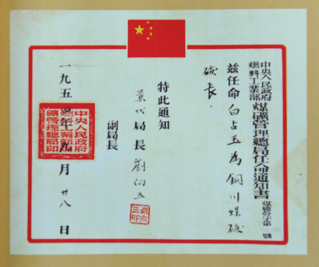 1953年,西北煤炭管理局613號文件決定從當年7月1日起,將同官、新泰、新建三個礦合并為“銅川煤礦”,任命白占玉為銅川煤礦礦長。1927年參加革命的白占玉,對黨的事業(yè)堅貞不屈,在從事地下工作中多次出生入死、化險化夷。他雖在革命中腿部留下傷殘,但投入銅川礦務(wù)局建設(shè)工作中時以頑強的毅力,從未因腿部傷殘影響工作。當時銅川礦區(qū)很荒涼,物資匱乏,沒有像樣的辦公地方。經(jīng)多方面努力,白占玉和建設(shè)者們在五里鋪半山坡上蓋起了當時銅川礦區(qū)第一座最漂亮的窯洞式三層辦公樓,解決了辦公問題,1955年11月1日銅川礦務(wù)局成立大會就是在這里舉行的。白占玉作為后來的銅川礦務(wù)局首任局長,他的任命書是由周總理親自簽發(fā)的,如今復(fù)印件就陳列的銅煤文化展覽館之內(nèi)。礦務(wù)局初建之時,事務(wù)繁雜、百業(yè)待舉、千頭萬緒,作為首任局長,白占玉經(jīng)常從早到晚上,奔波勞碌,傷腿痛的要命,只能靠老伴為他按摩,換洗包腳布等措施緩解疼痛,但第二天他又不顧疼痛,提前到達工作現(xiàn)場,安排新一天的各項工作任務(wù)。他經(jīng)常泡在工作現(xiàn)場,深入井下檢查安全工作,與礦工促膝交談,面對面現(xiàn)場解決問題,心貼心服務(wù)礦井和礦工的生產(chǎn)生活。他的小本子上,總是密密麻麻記著許多問題,除了礦工生產(chǎn)生活方面的事項,還有許多生產(chǎn)技術(shù)方面需要向?qū)I(yè)人員請教的問題。雖然自己是局長,但他從來不擺架子,對于生產(chǎn)技術(shù)方面的問題總是認真地拜技術(shù)人員為師,并向礦工兄弟學(xué)習(xí)和求教,最終通過勤學(xué)和實踐,使自己由一個門外漢變成了經(jīng)驗豐富的煤炭行業(yè)管理能手和銅川礦區(qū)煤炭生產(chǎn)工作的領(lǐng)路人。像他一樣的礦務(wù)局建設(shè)進程中的諸多領(lǐng)導(dǎo)者、管理者身上這種精神,對銅煤礦區(qū)和工友們的影響和教化,始終值得我們敬仰、學(xué)習(xí)和傳承。