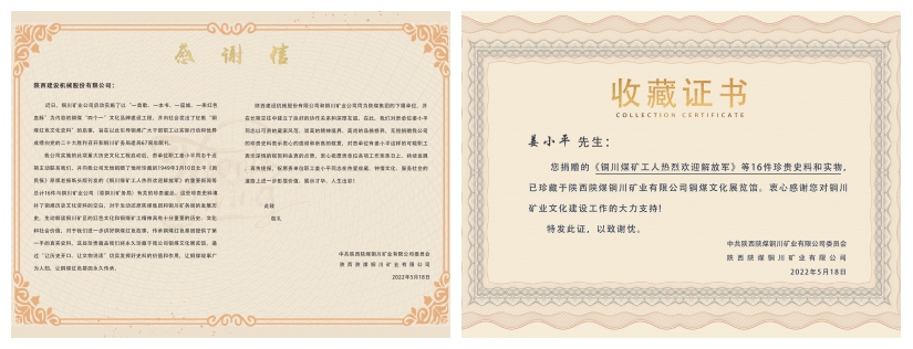 由于受疫情影響,姜小平先生未能來到捐贈(zèng)儀式現(xiàn)場(chǎng),筆者在進(jìn)行電話采訪時(shí),他表示“作為陜煤集團(tuán)所屬的陜建機(jī)公司的一名職工,作為一名陜煤人,能夠?yàn)殂~川礦業(yè)征集歷史文化資料盡一己之力,讓個(gè)人收集珍藏的銅煤文化史料回到陜煤、回到銅川,找到根源和歸宿,我感到很有意義?!彼瑫r(shí)表示“收藏并不是孤芳自賞,不是將藏品束之高閣,而是要讓其來源于社會(huì),服務(wù)于社會(huì),通過讓藏品‘說話’,更好地引導(dǎo)教育人鑒往知來、奮斗前行”。