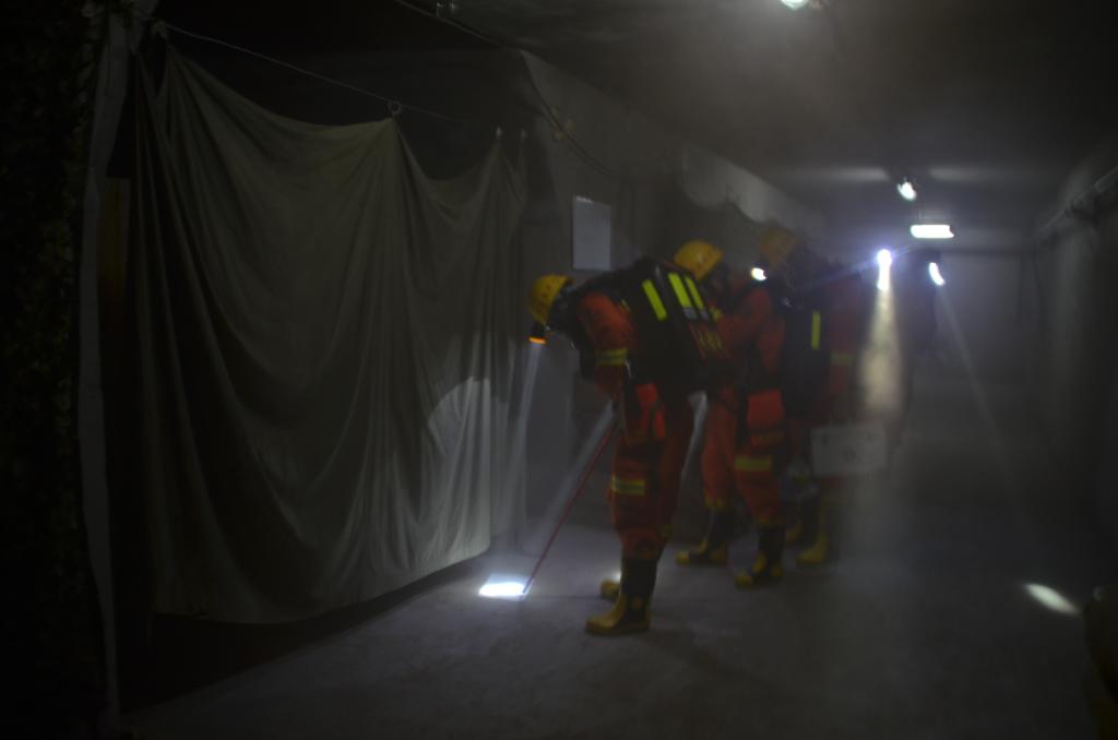 戰(zhàn)前檢查完畢后,隨著現(xiàn)場指揮員的一聲令下,救援小組背負著15公斤重的呼吸器和救援裝備快速進入巷道。巷道內(nèi)濃煙滾滾,熱浪襲人,溫度高達45度以上,指戰(zhàn)員們頂著高溫熱浪和極低能見度環(huán)境快速展開救援。