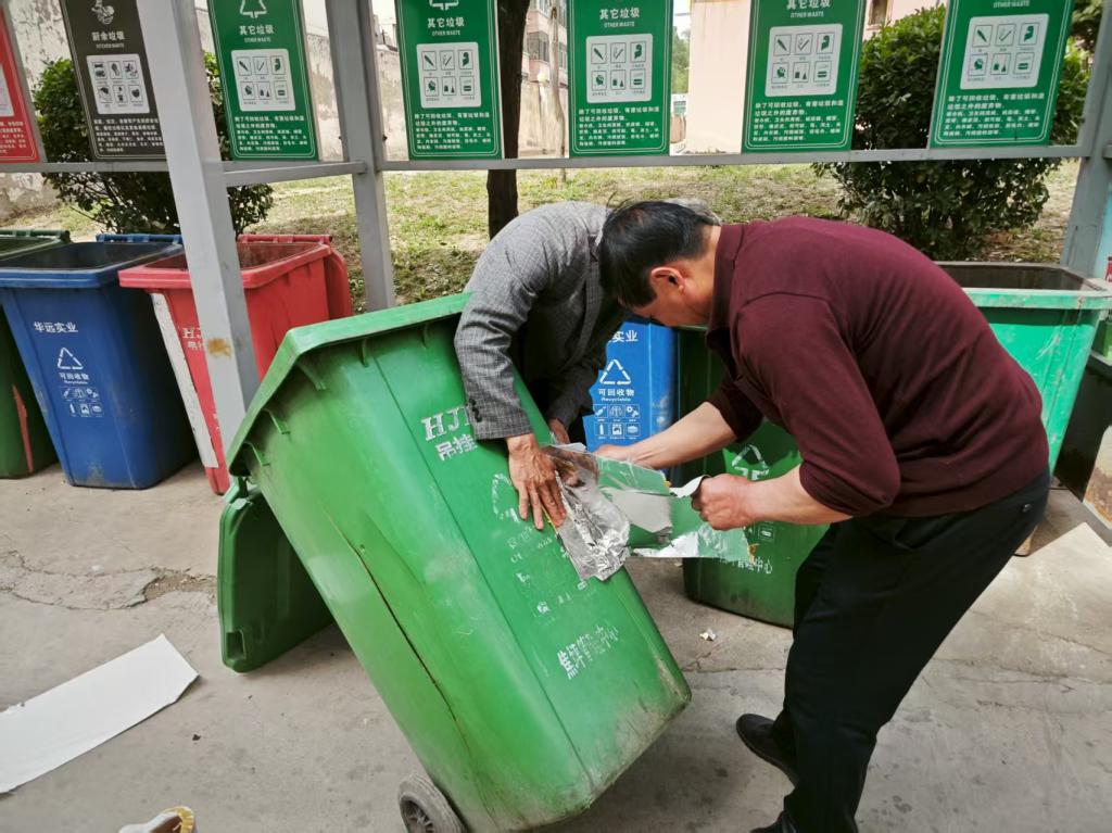 垃圾桶“煥新”:小修復省下大成本 該中心垃圾桶因長期使用,部分出現(xiàn)裂縫、破損等問題,若按常規(guī)換新,需投入不少費用。管理中心職工主動踐行“賺錢思維”,自發(fā)組成“修復小隊”。他們準備好強黏合力防水膠帶、鐵絲等材料,對破損垃圾桶進行“手術”,先用鐵絲對裂縫處打孔縫合加固,再用膠帶分別對垃圾桶內(nèi)外進行粘補,一番操作后,原本“傷痕累累”的垃圾桶又重新“上崗”。