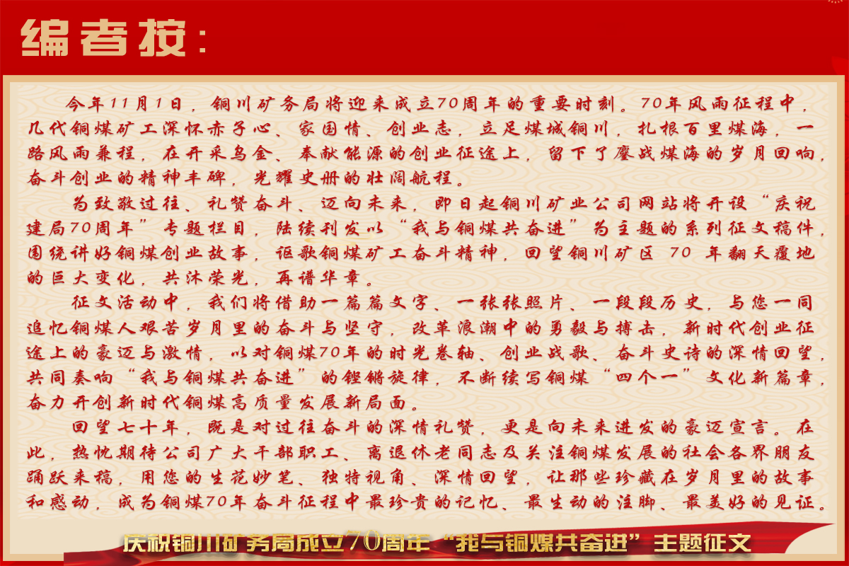當(dāng)時光的年輪行進到2025年,位于三秦大地、煤城銅川這方創(chuàng)業(yè)熱土上的銅川礦業(yè),也將迎來企業(yè)成立70周年的日子。在七秩春秋的奮斗中,幾代銅煤礦工把“能源報國、服務(wù)社會”的初心匯成礦區(qū)的光影記憶,把“開采烏金、奉獻光熱”的誓言鍛造成創(chuàng)業(yè)奮戰(zhàn)的鋼鐵脊梁,以一曲巍然挺立于渭北黑腰帶上的奮斗長歌,講述著屬于銅煤人的創(chuàng)業(yè)故事和動人史詩。