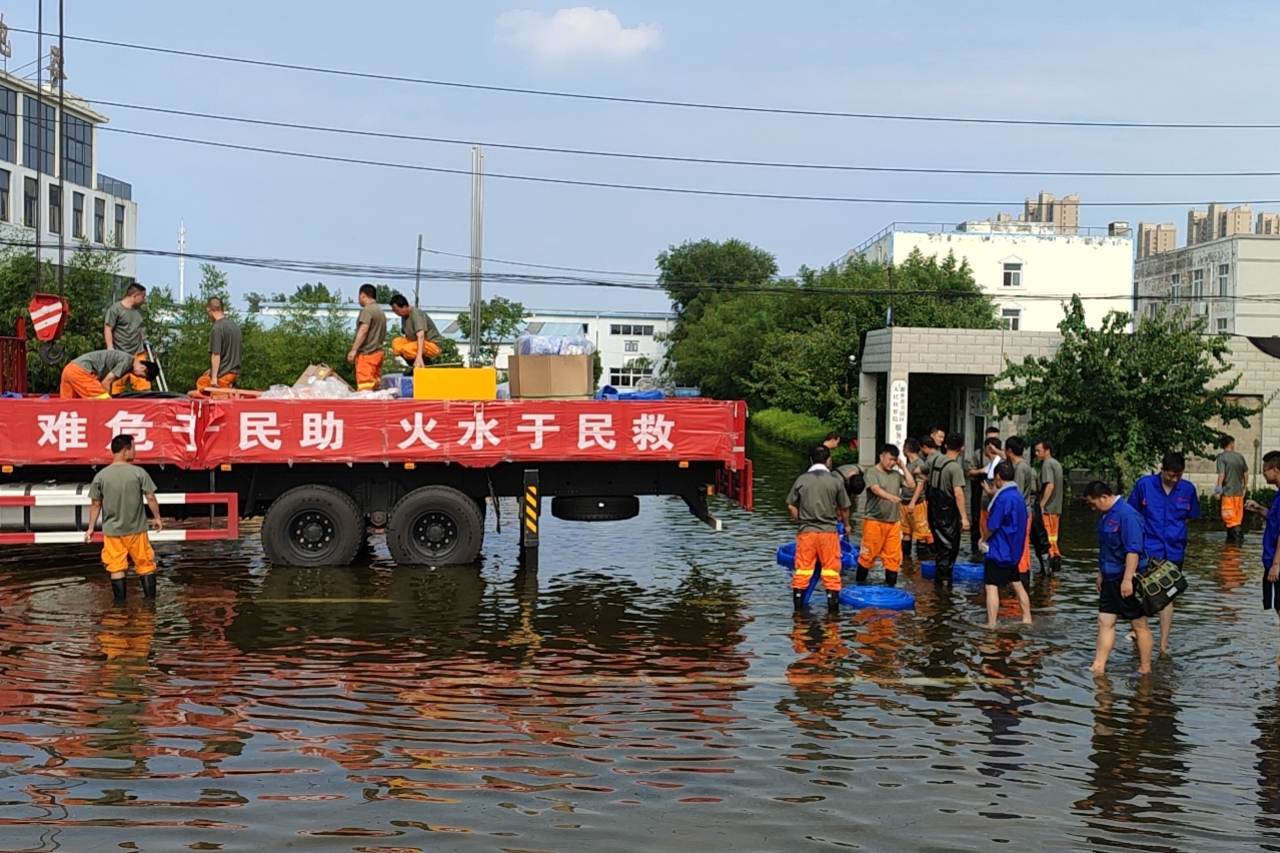 2021年7月,河南遭遇歷史罕見的特大暴雨,鄭州、新鄉(xiāng)等地城市內(nèi)澇嚴(yán)重,群眾被困、交通中斷。接到上級馳援指令時,大隊正在開展訓(xùn)練,隊員們來不及收拾行李,僅用1小時就完成人員集結(jié)、裝備裝車,連夜冒雨火速馳援河南救災(zāi)現(xiàn)場。抵達(dá)新鄉(xiāng)后,隊員們立即投入戰(zhàn)斗。在衛(wèi)輝市某小區(qū),積水最深處達(dá)2米,隊員們背著老人、抱著孩子,往返數(shù)十次轉(zhuǎn)移被困群眾;在某工業(yè)園區(qū),為盡快排出廠房積水,隊員們連續(xù)48小時奮戰(zhàn)救災(zāi)區(qū)域,餓了就啃方便面,困了就打個盹。連續(xù)13天里,共完成3個區(qū)域、5個排澇點的救災(zāi)任務(wù),排水總量約16萬立方米,轉(zhuǎn)移群眾36人,解救被困車輛8臺,被當(dāng)?shù)厝罕娪H切稱為“來自陜西的救命恩人”。