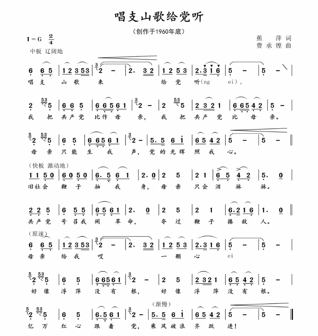 你知道《唱支山歌給黨聽》歌詞發(fā)表的來龍去脈嗎?你知道最早為《唱支山歌給黨聽》譜曲的曲作者不是朱踐耳,而是費(fèi)承鏗先生嗎?費(fèi)承鏗先生譜的曲又是怎么樣的呢?